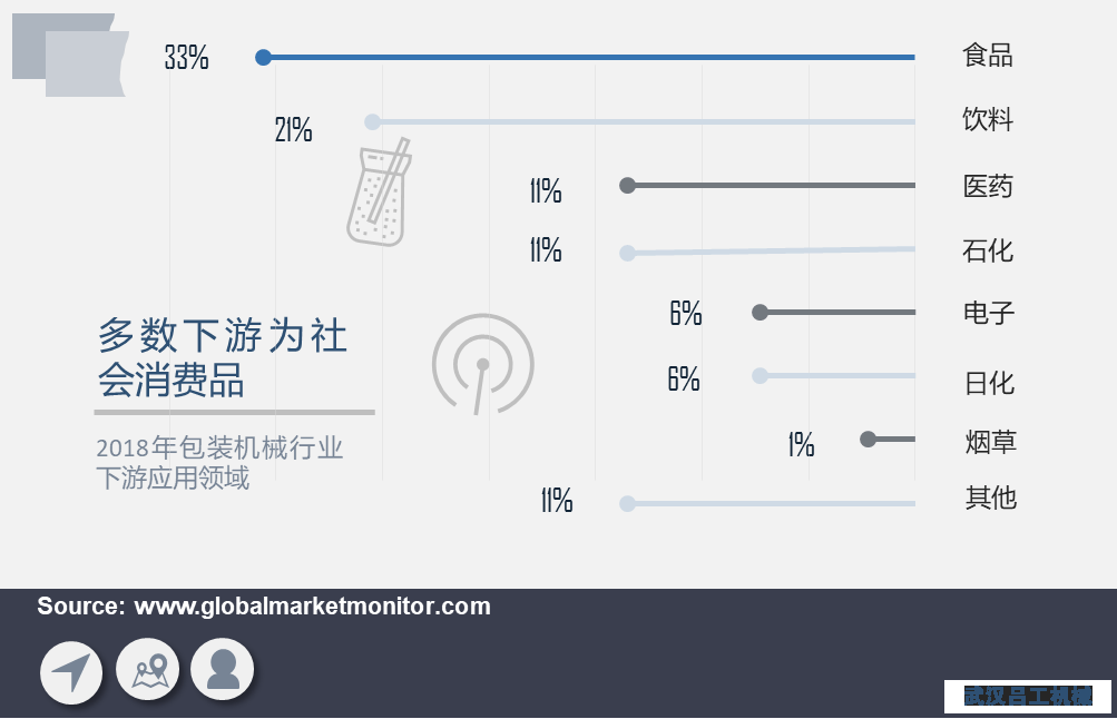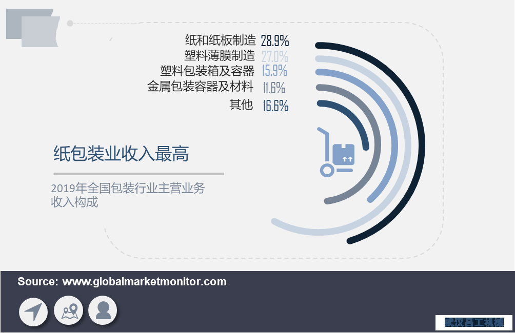 2019年,国内包装设备制造行业的主营业务收入达到354.6亿元,其中食品、饮料、医药是应用比例最高的三个市场,占整个包装的65%。由于食品,饮料和药品在宏观经济运作中的敏感性较低,因此包装行业的下游需求在总体上是长期向好的,尤其是快消品领域和快递领域业务扩张速度快。