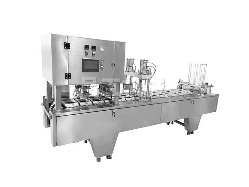 本机采用合理的机械传动,功能齐全,灌装、封口、切边、制品推出,废料收卷,印码等自动化工作,可节约人力,降低成本。本机有二次热封装置,料杯/碗/盒与封膜经过前后二次热封,封口牢固可靠。
